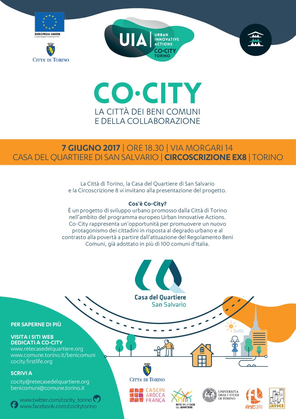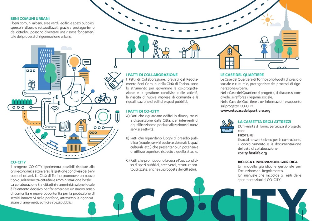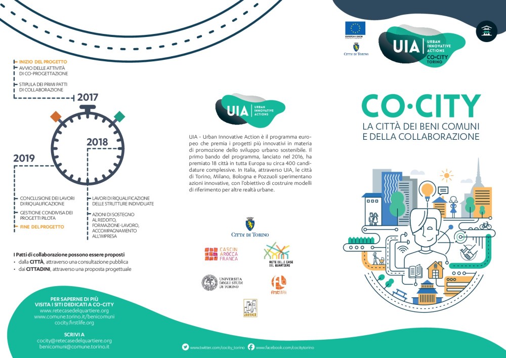 CO·CITY è un progetto di sviluppo urbano promosso dalla Città di Torino nell’ambito del programma europeo Urban Innovative Actions (UIA), avviato ad inizio 2017 e che si concluderà a fine 2019. Il progetto rappresenta un’opportunità per dar vita a soluzioni innovative per la cura e la gestione dei beni comuni della città, in risposta al degrado urbano e al contrasto alla povertà. A partire dall’attuazione del Regolamento Beni Comuni Urbani, (approvato a Torino nel gennaio 2016, e adottato similmente anche in più di 100 comuni d’Italia), la Città intende promuovere un nuovo protagonismo dei cittadini per rendere i beni comuni una risorsa fondamentale dei processi di coesione sociale e rigenerazione urbana.