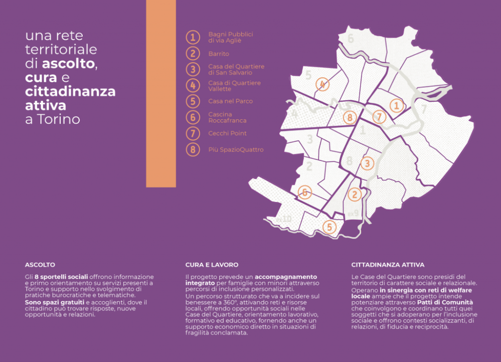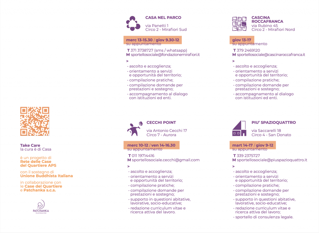Un progetto nato per incrementare servizi di ascolto, cura e cittadinanza attiva nei quartieri di Torino attraverso: 8 sportelli sociali di prossimità nelle Casa del Quartiere, percorsi di inclusione per famiglie con minori 0-18 anni, reti territoriali per il contrasto di povertà e fragilità e patti di comunità per rafforzare la collaborazione tra realtà di quartiere. Take Care – la cura è di Casa è un progetto di Rete delle Case del Quartiere APS in collaborazione con la Casa del Quartiere di San Salvario – Agenzia per lo Sviluppo Locale di San Salvario Onlus e le altre sette Case del Quartiere di Torino, con Patchanka s.c.s. e con il sostegno di Unione Buddhista Italiana.