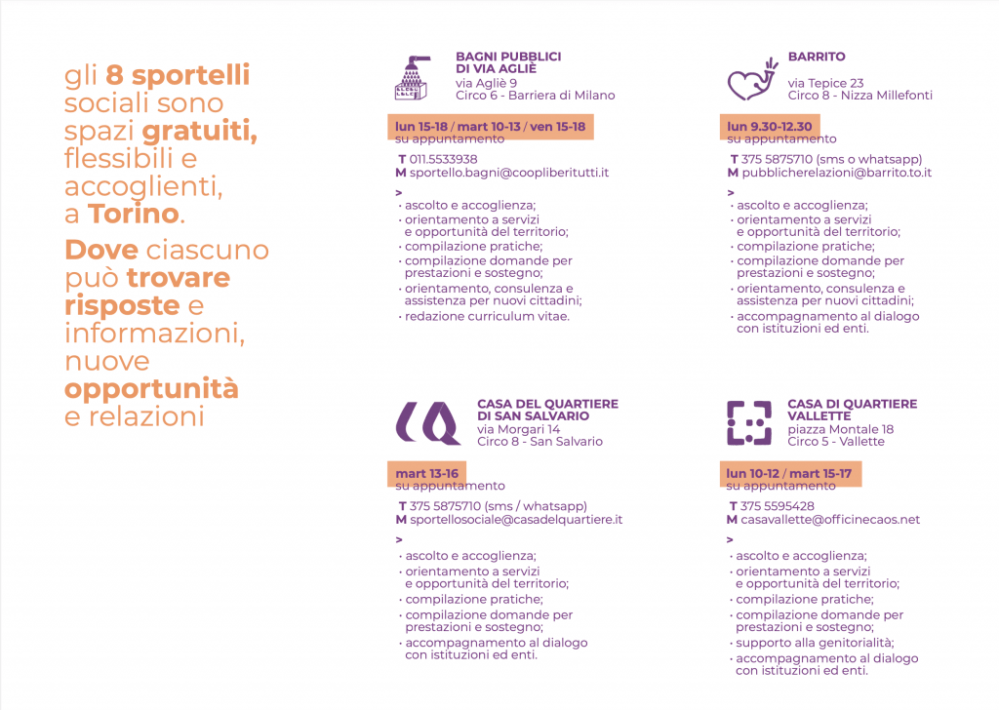Lo Sportello Sociale della Casa del Quartiere supporta le persone nell’ascolto e orientamento nell’ambito di:
